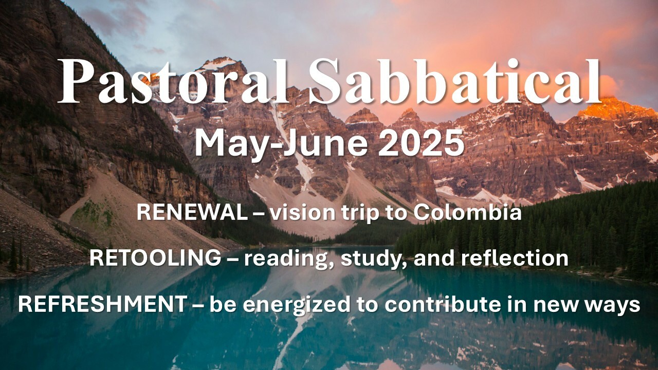 For the months of May and June our senior pastor will be on a sabbatical. This traditional term simply means a season for growth, renewal, and discovery. Pastor Brent will be on a vision trip to Medellin, Colombia where he will visit three of our ministry partners: Seeds of Love children's center, Diego and Claudia Cardona, and Jerusha Ricketts. He will also be doing some online learning around the themes of church transition and Gospel-centered ministry. There will also be opportunity for rest and refreshment. This will include visitng family in Alberta and going away with Lana to the Island to celebrate their wedding anniversary. During Pastor Brent's absence several of our leaders will be stepping in to assist with our worship services and ministry activities.